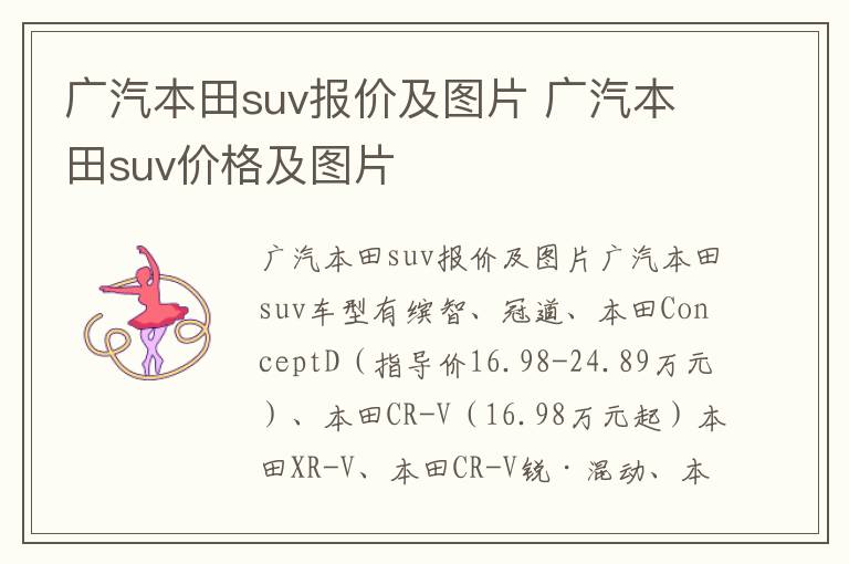广汽本田suv车型有缤智、冠道、本田Concept D(指导价16.98-24.89万元)、本田CR-V(16.98万元起)本田XR-V、本田CR-V锐·混动、本田UR-V。本田缤智现在的报价是在11.38-17.48万之间。本田缤智从外观方面十分年轻,很耐看。黑色烤漆的中网饰板加上镀铬点缀,与大灯组很好的连为一体,看上去整体感很强。隐藏式后门把手比较新颖,复杂的车尾线条增添了层次感。内饰方面本田缤智采用了本田家族标志性的非对称设计,可能有的人不会欣赏,但是的确别有意味。中控台上的塑料件显得有点廉价,仪表盘设计合理,看上去十分方便。冠道2017款 240TURBO 两驱精英版。参考价格20.50万。搭载的是1.5T193马力L4的发动机。变速箱是CVT无级变速。2017款 370TURBO 两驱精英版。参考价格25.88万。