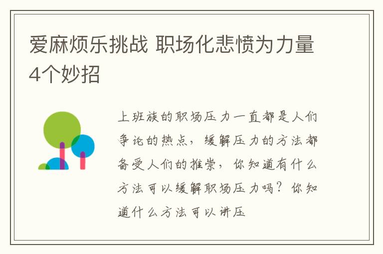 上班族的职场压力一直都是人们争论的热点,缓解压力的方法都备受人们的推崇,你知道有什么方法可以缓解职场压力吗?你知道什么方法可以讲压力转化为动力吗?