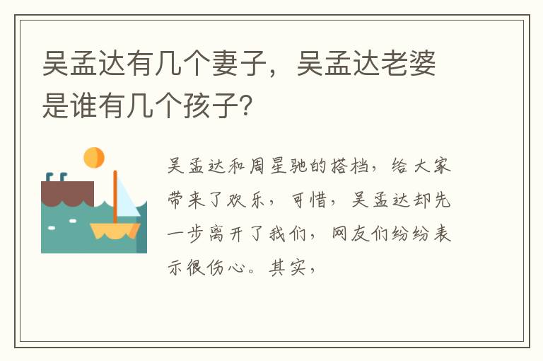 吴孟达和周星驰的搭档,给大家带来了欢乐,可惜,吴孟达却先一步离开了我们,网友们纷纷表示很伤心。其实,吴孟达的一生也很精彩,感情纠葛也比较多,今天就给大家说说,吴孟达有几个妻子?有几个孩子?